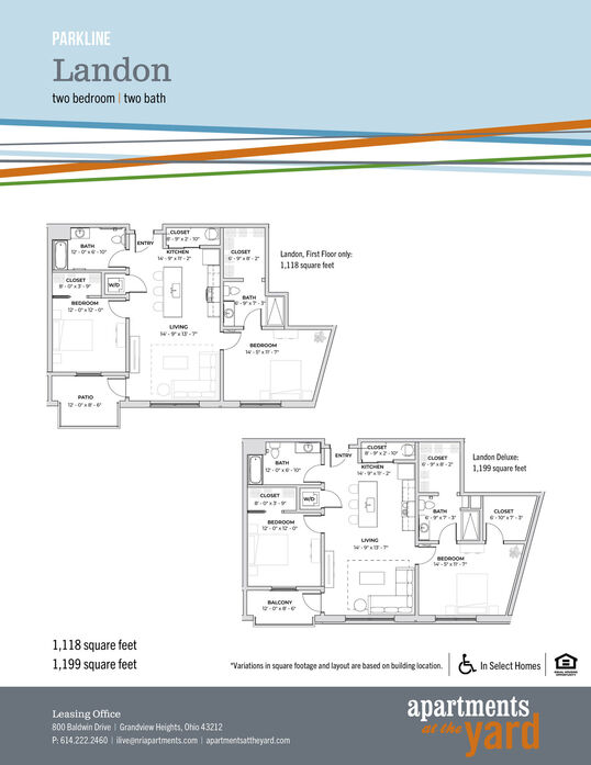 The Landon floor plan offers 1,118–1,199 square feet of modern comfort with two bedrooms and two baths. Enjoy elevated finishes like quartz countertops, a stylish kitchen island with backsplash, and wood-like flooring throughout the main areas and bathrooms, complemented by carpeted bedrooms for added comfort. Each home includes large closets, in-unit washer and dryer, and a balcony or patio option with a pool view. The Deluxe plan has an extra closet in the primary bedroom. ADA accessible options available.
